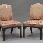 A pair of 20th century mahogany chairs, reproduced from an original in No. 10 Downing Street, London, the overstuffed seats and backs raised on blind fretwork block legs, height 150cm, width 61cm.