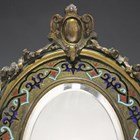 A 19th century French bronze and champlevé enamelled table mirror, the oval frame with a cartouche and foliate surmount, the stand with a pair of seated putti, height 24.5cm, width 16cm.