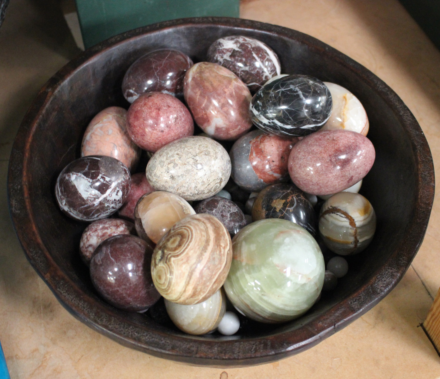 A selection of hardstone specimen marbles and eggs, contained within a wooden bowl, diameter 33cm.