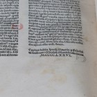 INCUNABULA. - BIBLE, In Latin. Incipit epl'a sancti Hieronym ad Paulinu[m]. Venice: Franciscus de Hailbrun and Nicolaus de Frankfordian, 1476. Folio (275 x 193mm.) Headline, 51 lines, double-column, initial of prologue with intricate ornamental penwork in red, blue and green, the rest with Lombard initials in red and blue, signatures a-h[10], i-l[12], m-s[10], t-v[12], x-y[10], 1-6[10],, 7-10[12], 11-13[10], 14[12], 15-17[10],18[12], A[10], B-C[12], dated to colophon at 18[12]. (Collates complete but for last leaf of the table at rear, C11, replaced in facsimile, occasional marginal worming, contemporary annotation in Latin and inscription to initial blank, marginal leaf repair to v12 and initial blank, rear leaves C8-C10 with damp-stain, small paper infill to C10, rear blank replaced, pencil note of previous collation by Bernard A. Quaritch to rear pastedown.) 17th century calf, blind-stamped, four raised bands to the spine, gilt lettering to the second compartment, bronze corners and clasps (worming to spine ends, lacking metal bosses to covers). Note: the annotation in Latin is occasional but sometimes lively, 'Oh Bone Deus' and may also reflect the life of a previous owner in monastic orders ('Credo firmiter vidi: cognoui tetigi et penitui Notate des Hoc defectu est Cannis').
