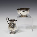 A George I style Britannia standard silver cream jug and sugar bowl, London 1935 by Goldsmiths & Silversmiths Co Ltd, height of jug 10.3cm.