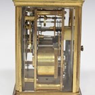 An early 20th century French lacquered brass carriage clock with eight day movement repeating and striking hours and half-hours on a gong, the enamel dial with black Roman numerals and inscribed 'J.W. Benson, London, French Make', the corniche case with swing handle and bevelled glass panels, on bracket feet, height 16.5cm, with leather travelling case.