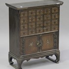 A 20th century Chinese elm medicine cabinet, fitted with twenty inscribed drawers above a cupboard, on shaped feet, height 76cm, width 63cm, depth 27cm.