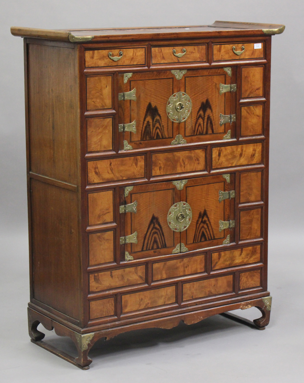A 20th century South-east Asian softwood and brass mounted side cabinet, fitted with three drawers above two cupboards, on bracket feet, height 139cm, width 109cm, depth 50cm.