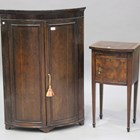 A late George III oak hanging bowfront corner cabinet, height 110cm, width 76cm, together with a 20th century walnut bedside cabinet, height 76cm, width 41cm, depth 33cm.