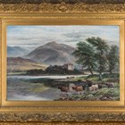 William Langley - Highland Cattle watering from a Loch, a Castle beyond, late 19th/early 20th century oil on canvas, signed, 49.5cm x 74.5cm, within a gilt composition frame.