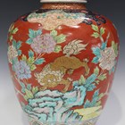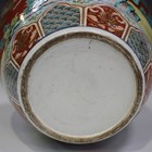 A Japanese Imari porcelain vase, Meiji period, the stout ovoid body painted and gilt with four Buddhistic lions amidst peonies on an iron red ground, beneath a simulated brocade collar and neck, unmarked, height 36.5cm.