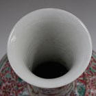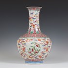 A Chinese famille rose enamelled porcelain bottle vase, mark of Guangxu and probably of the period, the globular body painted with iron red bats flying amidst polychrome vapours, framing alternating panels of fruiting peach branches and magpies perched in prunus branches, the flared neck with further bats and vapours, between pink ground banded borders filled with polychrome lotus and scrolling tendrils, underglaze blue six character mark to base, height 43cm.
