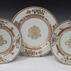 A Chinese famille verte export porcelain circular dish, Kangxi period, the centre with gilt monogram within iron red and gilt borders, the rim painted and gilt with four flower sprays, diameter 31.7cm, together with a pair of matching smaller dishes, diameter 26.7cm (some restoration).
