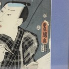 Toyokuni III (Kunisada) (1786-1864) - two Japanese woodblock oban tateye prints, circa 1852 and 1854, depicting a head and shoulders portrait of a lady and a half-length portrait of two gentlemen, one painting a fan, 35cm x 24.5cm, framed and glazed, together with another Japanese woodblock print, framed and glazed.
