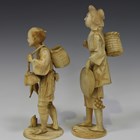 Two Japanese carved sectional ivory okimono figures, Meiji period, one modelled as a lady carrying a hat and basket, height 21cm, the other of a fisherman carrying two fish, height 18cm, each inset with a red lacquer signature plaque to base (minor faults).