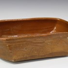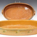 A graduated pair of Portuguese Mafra terracotta pottery baking dishes, early 20th century, of oval shape, painted with flowers, impressed marks, lengths 60cm and 47cm, together with a similar rectangular dish.