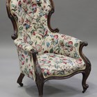 A Victorian mahogany showframe salon armchair with carved decoration, upholstered in floral fabric, raised on cabriole legs, height 108cm, width 73cm.