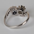 A white gold, diamond and sapphire crossover ring, claw set with the principal circular cut diamond and the principal circular cut sapphire between diamond set sides, detailed '18ct', ring size approx N, total diamond weight approx 0.75ct, sapphire weight approx 0.68ct.