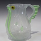 A Loetz lemonade jug and two beakers, early 20th century, designed by Richard Teschner, the milky jug of zoomorphic form with applied features, the matching beakers with green teardrop decoration, indistinct acid etched mark to jug, height of jug 18cm (minor faults).