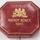 An Edward VII Maundy set 1907, comprising fourpence, threepence and twopence (penny lacking), in a gilt-tooled red leather case.