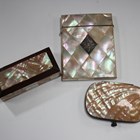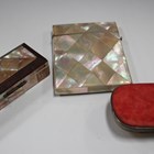 A Victorian mother-of-pearl visiting card case with engraved white metal inset plaque, length 10.3cm, together with a mother-of-pearl stamp box and a purse.
