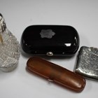 A 19th century French tortoiseshell piqué inlaid cigarette case, the front inlaid with a stem of flowers, leaves and tendrils, the reverse with a vacant shield shaped cartouche, length 8cm, together with a George III horn toothpick box, applied with an initial engraved panel, length 7.7cm, a silver vesta case and a cut glass snuff bottle with plated collar, the domed cover revealing a gilt metal spoon, height 8cm.