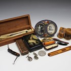 A small group of collectors' items and objects of virtu, including a 19th century Russian papier-mâché snuff box, length 8.5cm, an Italian micro-mosaic frame, four pieces of Mauchline ware, a tortoiseshell mounted penknife and a selection of mainly George III needlework items.