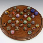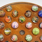 A Victorian mahogany solitaire board and thirty-two glass marbles, diameter of board 30cm.