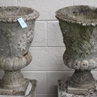 A pair of cast concrete garden urns, decorated with flowers, raised on matched shaped pedestals, height 109cm, diameter 41cm (some faults).