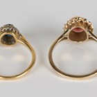 A gold, sapphire and diamond oval cluster ring, detailed '18ct', a 9ct gold, sapphire and colourless gem set three stone ring, a 9ct gold ring, mounted with an oval cut garnet, and another gold ring, mounted with three garnets and two pairs of small diamonds, detailed '9ct'.
