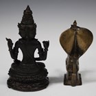An Indian brass figure group of the Nandi bull with detachable naga (cobra) hood, 19th century, on a rectangular plinth base, height 14.5cm, together with a bronze bodhisattva, height 18cm.