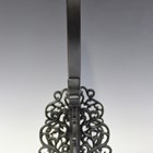 A Chinese hardwood and dream stone marble table screen and stand, early 20th century, the central circular panel with black and red characters within a frame with pierced scrolling tendril border, the stand with pierced tendril panels framing a shou medallion, on scroll feet, total height 44.8cm.
