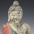 A South-east Asian polychrome carved and painted wood figure of Buddha, modelled seated in dhyanasana on a double lotus base, height 40.5cm.