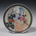 A Chinese famille rose porcelain plate, mark of Qianlong but Republic period, painted with a figural scene within a black and iron red printed rim, blue enamelled pseudo four-character mark to base, diameter 24.5cm.