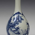 A Chinese blue and white porcelain bottle vase, Qing dynasty, the pear form body painted with three figures on horseback approaching a bridge and figure in a boat, unmarked, height 18cm.