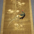 A Japanese silk embroidered hanging panel, early 20th century, worked in coloured threads with a pheasant beneath chrysanthemums, pine and two flying sparrows, 106cm x 46cm (some faults).