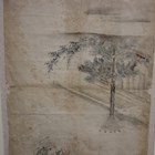 A Chinese scroll painting on paper, Qing dynasty, depicting two musicians and a dancing boy beside a tree, lines of black text and red seals to upper left and lower right corners, 104cm x 40.3cm, framed and glazed (some damage, laid down).
