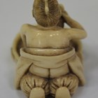 A Japanese carved ivory netsuke, Meiji period, modelled as a man kneeling over a shallow bowl of noodles, grasping a handful of noodles in his right hand, unsigned, height 3cm.