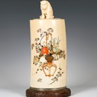 A Japanese Shibayama inlaid ivory tusk vase and cover with integral carved wood stand, Meiji period, the tusk finely inlaid in mother-of-pearl and other hardstones, one side with a flower basket on a stand, the other side with two sparrows flying above blossoming branches, inlaid mother-of-pearl signature plaque to side, the cover with seated monkey surmount, the underside with incised and stained signatures, total height 39cm (minor losses and faults, and cover not fitting due to natural shrinkage).