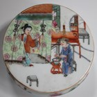 A Chinese famille rose porcelain circular box and cover, mark of Xianfeng but later, the top painted with two figures in an interior scene, iron red enamelled pseudo seal mark to base, diameter 8.5cm, together with another famille rose circular box and cover, diameter 9.2cm (repaired), and a blue and white circular box and cover, diameter 9.2cm (cover repaired).