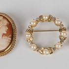 A 9ct gold mounted oval shell cameo brooch, carved as a portrait of a lady within a pierced wirework surround, width 3.2cm, fitted with a safety chain, a pair of 9ct gold and cultured pearl earclips and a costume brooch, with a case.