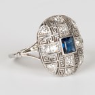 A gold, sapphire and diamond oval panel shaped ring, mounted with a square cut sapphire within a pierced Greek key surround, mounted with circular cut diamonds, between split shoulders, ring size approx M, with a case.