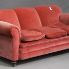 A George V three seat settee, upholstered in pink velour, on bun feet, height 81cm, width 200cm, depth 92cm.