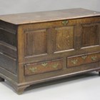 A George III oak mule chest, the hinged lid above a panelled and crossbanded front, fitted with two drawers, on bracket feet, height 83cm, width 130cm, depth 54cm.