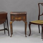 An Edwardian mahogany oval drop-flap occasional table, height 70cm, width 86cm, depth 56cm, together with an Edwardian side chair, an occasional table and a 20th century reproduction side table, height 69cm, width 49cm.