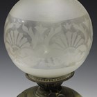 A late Victorian brass table oil lamp with an acid etched glass shade and pink glass reservoir, height 62cm, together with another brass table oil lamp.