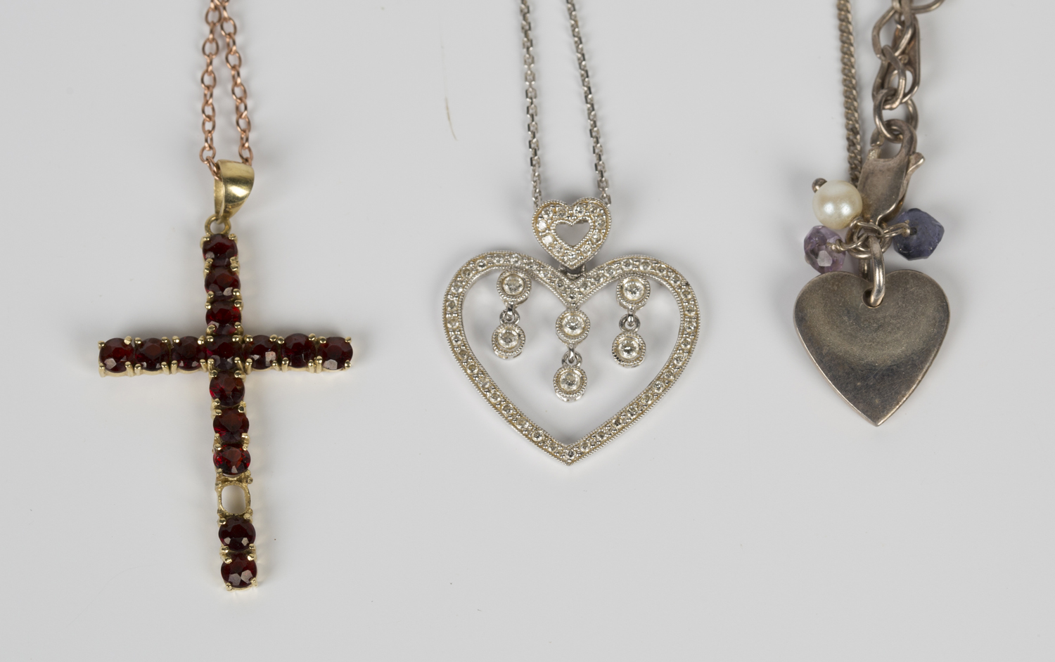 A white gold and diamond pendant in an open heart shaped design with diamond set pendant drops, detailed '18K 750', length 2.3cm, with a white gold neckchain on a boltring clasp, detailed '750', length 44.5cm, a gold and garnet pendant cross, length 3.7cm (one garnet lacking), with a gold neckchain, length 46cm, and a silver bracelet with a heart shaped pendant.