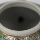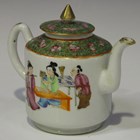 A Chinese Canton famille rose porcelain teapot and cover, mid to late 19th century, of diminutive cylindrical form, the body painted with figures beneath bands of pink lotus and green tendrils on a gilt ground, height 11cm.