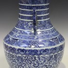 A Chinese blue and white porcelain hu-form vase, mark of Qianlong but probably late 20th century, the body painted with lotus and Buddhistic emblems amongst leafy scrolling tendrils, the shoulder and flared neck with bands of flowers, bats, vapours, scrolls, phoenixes, keyfret, trellis and shou medallions beneath a stiff leaf border, flanked by a pair of pierced scroll handles, underglaze blue seal mark to base, height 38.8cm.
