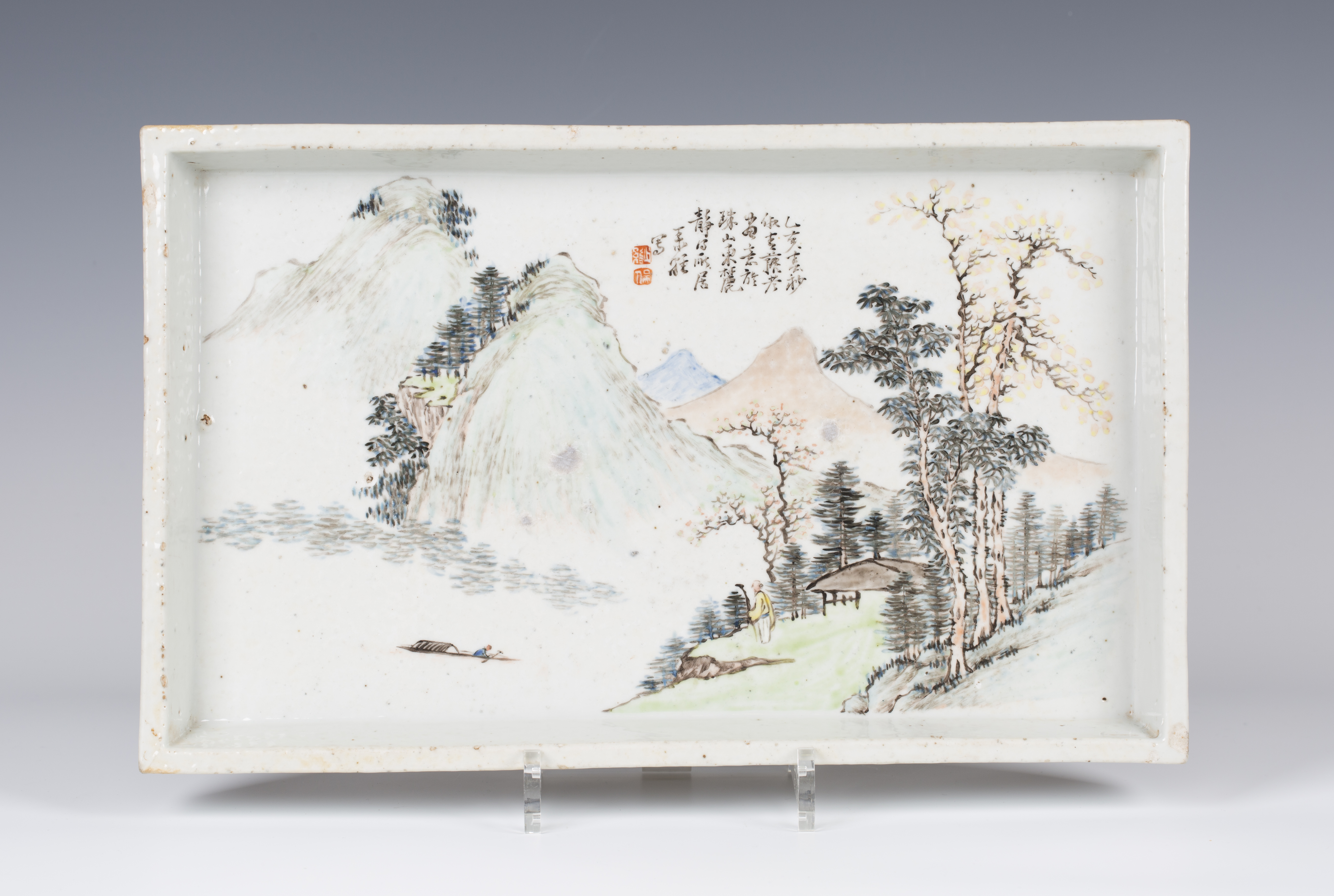 A Chinese Qianjiangcai enamelled porcelain rectangular tray, probably late Qing dynasty, painted with a landscape of a figure standing at a cliff edge looking out on to a lake as a boat approaches, with mountains and trees beyond, black painted text and two red seals bearing mark of Jin Pinqing above, length 38.8cm, width 23.7cm (chip to rim).