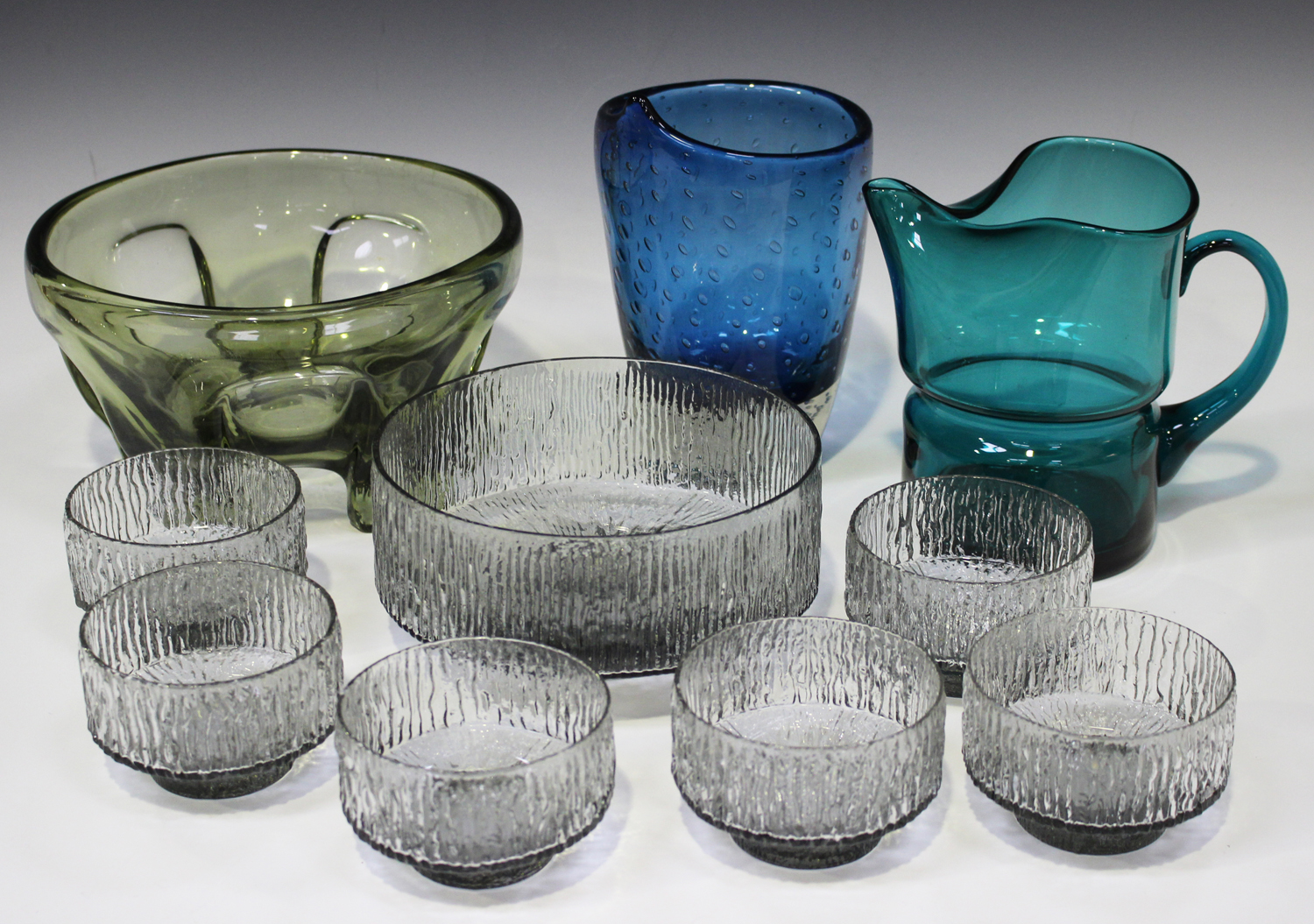 A group of glassware, mid-20th century, including a Whitefriars Kingfisher Blue controlled bubble pulled lip vase, height 20.5cm, a Whitefriars textured icicle pattern fruit bowl and six matching sundae bowls, and a Dartington green tinted jug.