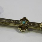 A Victorian gold and turquoise inset propelling pencil in the form of a cross with engraved decoration and fitted with a fob suspension loop, length 6cm.