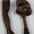 An 18th century carved boxwood pipe tamper in the form of a seated dog, the metal mounted terminal engraved 'In Memory of Wm Howard Jas Stower', length 9.5cm, together with a 19th century carved wooden tamper in the form of an arm holding a ball.