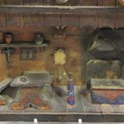 An early 20th century Swiss Black Forest carved softwood musical diorama, modelled in the form of a cottage interior, width 22cm, together with a set of bone dominoes, within a mahogany case, and three Ivorex oval portrait panels.